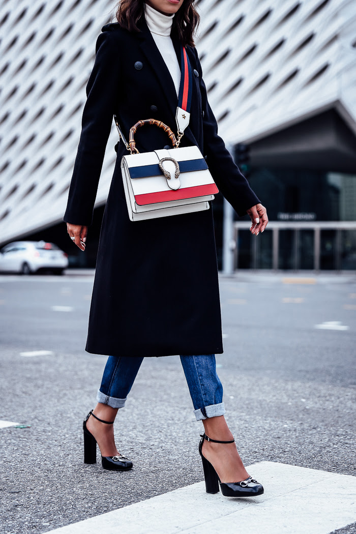 Today's look began with two new favorites from David Yurman's Stax Collection I picked up at Neiman Marcus recently. Because I am such a huge fan of David Yurman jewelry, I can never pass up on an opportunity to add a few more pieces to my ever-expending collection of David Yurman jewels and Neiman Marcus is usually my first stop because it has the most wonderful selection and exclusive pieces which are not available in other stores, like the Silver Ice Stax Collection pieces I am sporting in today's look. Available exclusively at Neiman Marcus, I feel in love with these pieces the moment I saw them! Sleek, sophisticated, and modern, I absolutely adore how versatile these pieces are. You can pair them with the simplest of looks, but they certainly go beautifully with more sophisticated pieces as well. When I began styling this particular outfit, I really wanted it to reflect contemporary elegance of these pieces, which is why I chose to combine effortless, classically-elegant pieces like a double-breasted coat and a top handle structured satchel bag with casual basics like boyfriend jeans and a simple cotton turtleneck.